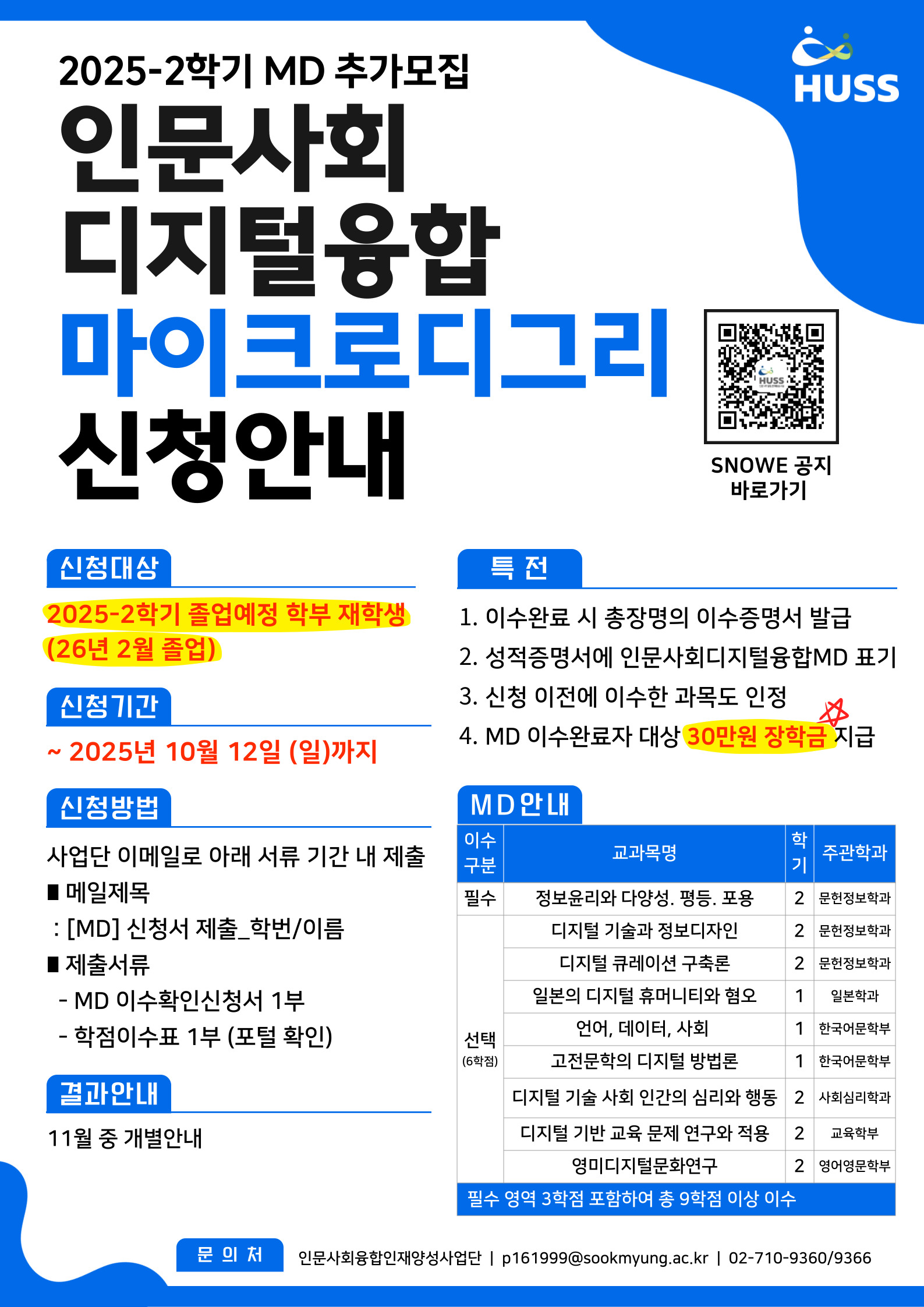 HUSS 인문사회융합인재양성사업단에서는 26년 2월 졸업 예정자를 대상으로 2025학년도 2학기 "인문사회디지털융합 마이크로디그리(MD)" 과정 이수자를 추가 모집합니다.