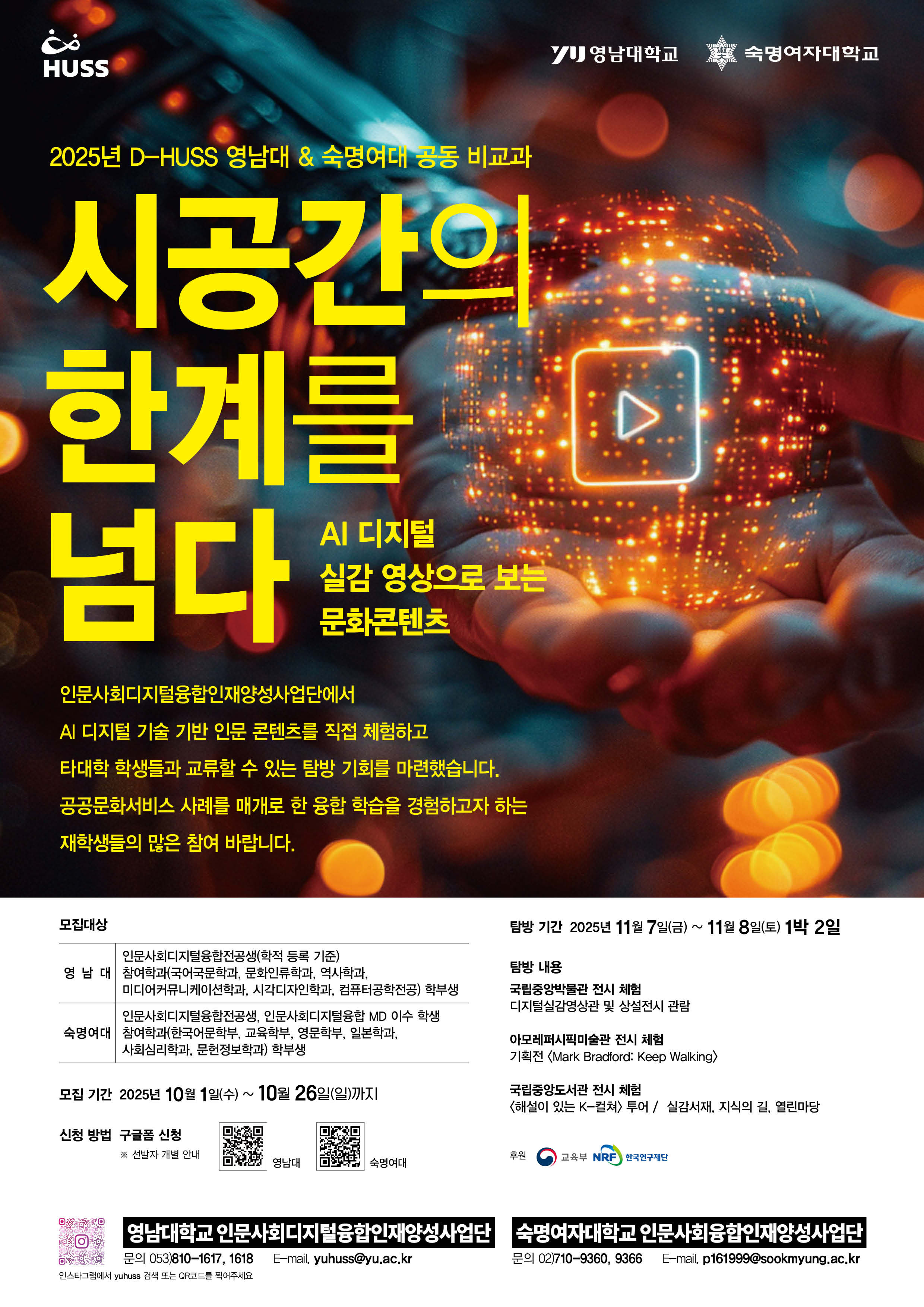 HUSS 인문사회융합인재양성사업단에서는 영남대학교와 공동으로 진행하는 [AI 디지털 실감 영상으로 보는 문화 콘텐츠 : 시공간의 한계를 넘다] 탐방 비교과 프로그램 참가자를 모집합니다.