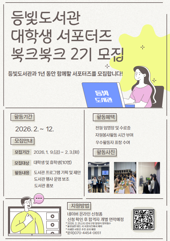 -서포터즈 활동내용: 도서관 프로그램 기획/제안, 도서관 행사 운영 보조, 도서관 홍보 등