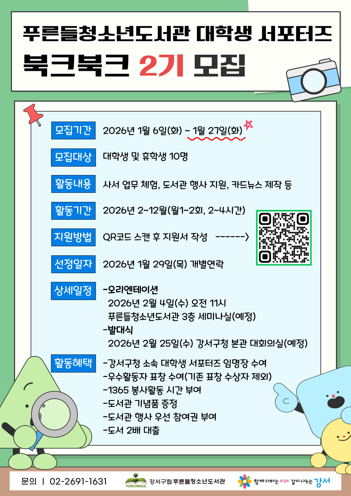 [홍보] 강서구립 등빛도서관 서포터즈 북크북크 2기 모집문헌정보학과 2026-01-12 11:35:27.0