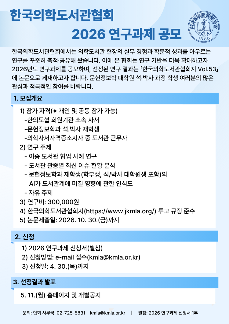 한국의학도서관협회 2026 연구과제 공모 안내